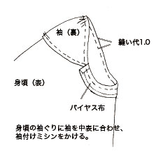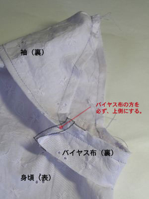 袖下のバイヤス布は1枚布での説明です。