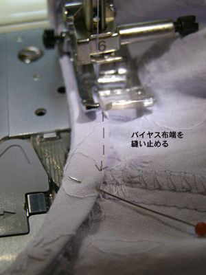 【8】バイヤス布端にミシンをかける。