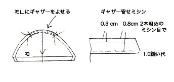 ■ 身頃と袖を縫い合わせる前に、袖は、袖山にギャザーを寄せ、袖口は三つ折りステッチをかけておく。